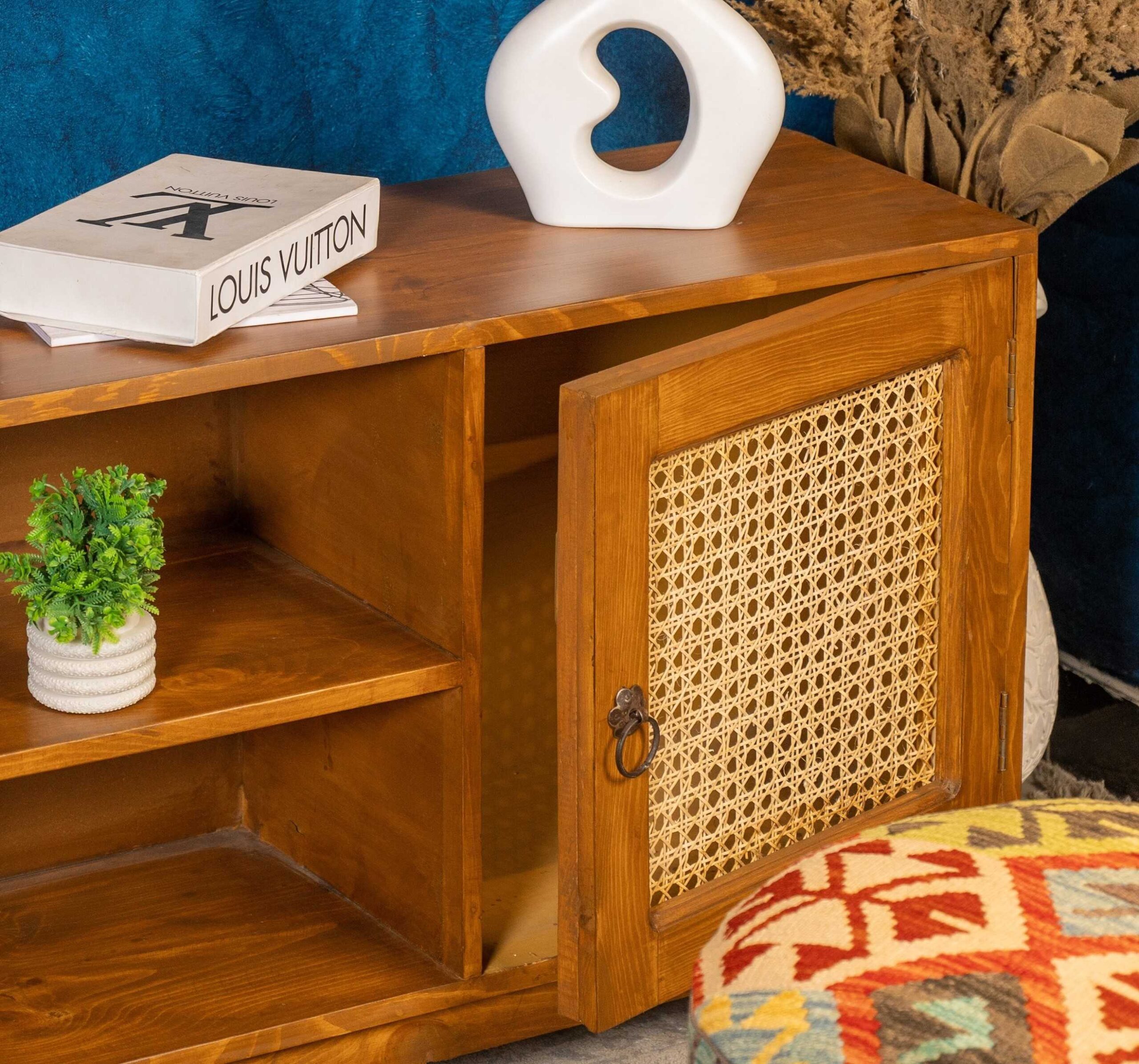 Celvar Chester blends warm wood tones with cane detailing for a look that feels both modern and timeless. The clean rectangular form is softened by woven cane door panels, while the open center shelves create an easy, balanced display area. Raised on tapered legs, it sits lightly in the space, ideal for Pakistani living rooms, dining areas, or entry corners where you want warmth without clutter. Designed with a calm, versatile presence, it complements furniture design in Pakistan trends and pairs beautifully with contemporary décor styles.