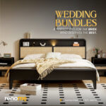 - Dream wedding furniture package bed’s features are a comfortable curved headboard, a unique wood-stained base, modern side tables with storage, and comes with a lifetime frame warranty.