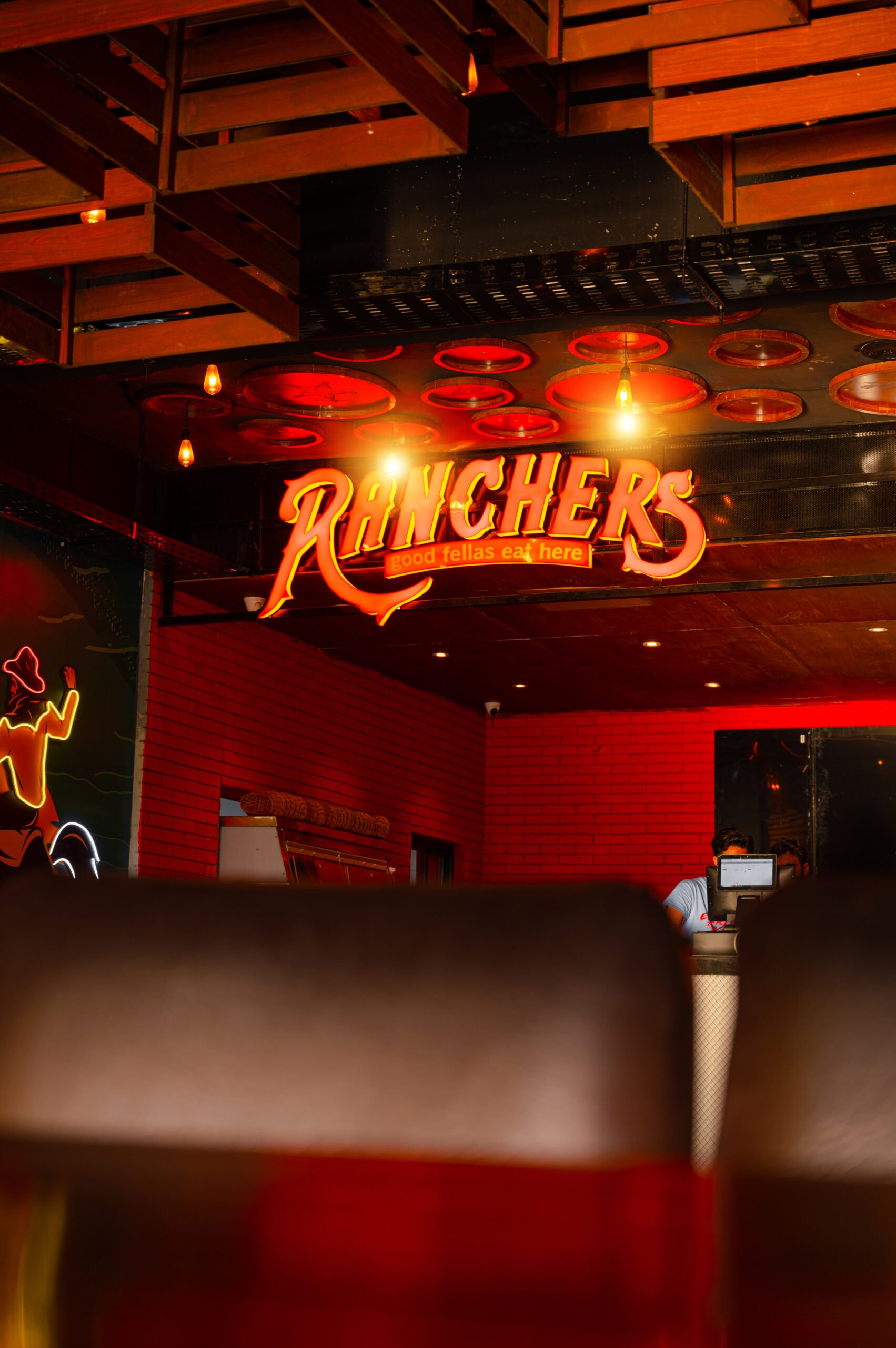 Renome Interiors crafted a dynamic interior inspired by Western ranch aesthetics, using warm wooden tones, textured surfaces, industrial-style accents, and ambient lighting to evoke a contemporary yet nostalgic atmosphere. Strategic seating zones were created to balance community seating with intimate corners.